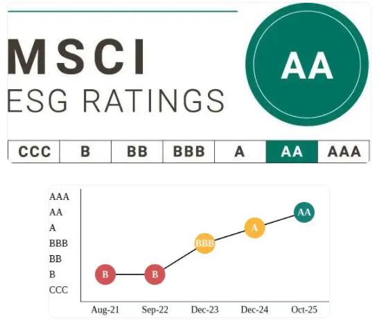 2025年10月7日,国际权威评级机构MSCI(明晟)发布最新ESG评级结果,纳思达(股票代码:002180)评级由“A”提升至“AA”,实现了自2022年”B“级起步的连续四年稳步跃升。这一成绩标志着纳思达在环境、社会及治理(ESG)领域的系统化建设与持续改进,获得了国际资本市场的高度认可,展现出公司将可持续发展理念深度融入战略与运营的坚定决心与扎实成效。