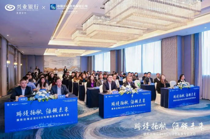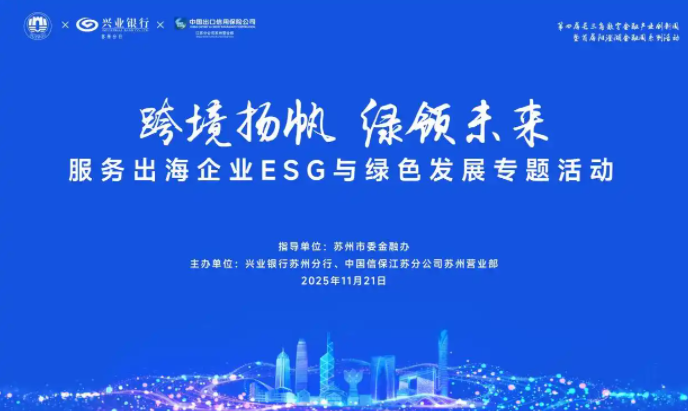初冬寒意渐,外贸热潮涌。为助力苏州出海企业破解ESG合规难题,增强企业“走出去”综合能力,进一步书写好绿色金融大文章,今天(11月21日),由苏州市委金融办指导,兴业银行苏州分行与中国信保苏州营业部联合主办的“跨境扬帆 绿领未来”服务出海企业ESG与绿色发展专题活动成功举办。作为苏州市首届阳澄湖金融周暨第四届长三角数字金融产业创新周子活动,活动邀请了来自苏州新能源、高端装备等领域的出海企业高管齐聚一堂,共话绿色转型与海外拓展新路径。