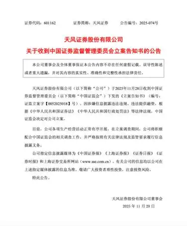 涉及两项违法违规,天风证券被立案调查