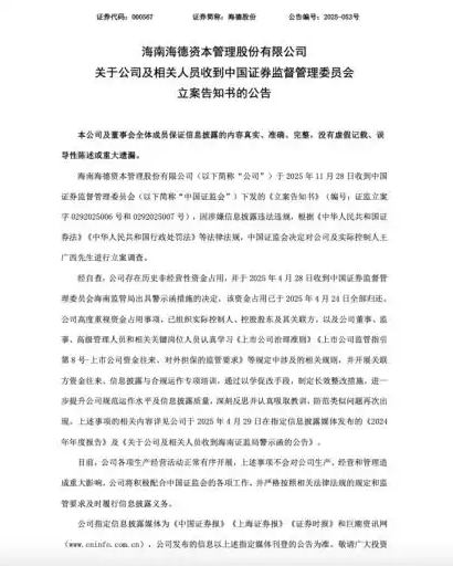 一人被立案调查,三家上市公司紧急发布公告。11月28日,海南海德资本管理股份有限公司(以下简称“海德股份”000567.SZ)发布公告,公司于2025年11月28日收到中国证监会送达的《立案告知书》。因公司及实际控制人王广西涉嫌信息披露违法违规,中国证监会决定对二者展开立案调查。
