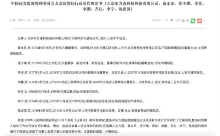 11月26日,中国证监会北京监管局发布《中国证券监督管理委员会北京监管局行政处罚决定书(北京东方通科技股份有限公司、黄永军、徐少璞、李忱、李鹏、齐红、李宁、陈忠国)》中国证监会北京监管局对北京东方通科技股份有限公司(以下简称“*ST东通” 300379.SZ)作出行政处罚决定:因2019年至2022年,北京东方通科技通过全资子公司泰策科技“虚构业务、提前确认收入”,虚增收入累计43233.69万元、虚增利润累计29417.63万元,且在2022年北京东方通科技向特定对象发行股票的《募集说明书》中引用虚假财务数据,构成“信息披露虚假记载”及“欺诈发行”双重违法,公司被责令改正、给予警告,并处以合计22900万元罚款。