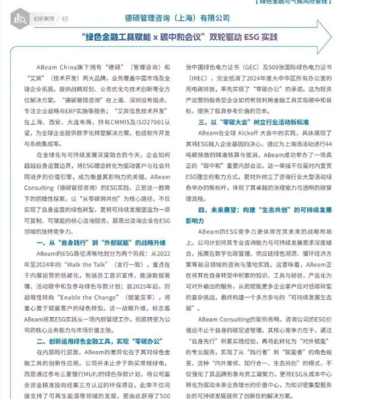 活动中,ABeam旗下德硕管理咨询(上海)有限公司凭借“绿色金融工具赋能 × 碳中和会议实践”案例,再度荣获年度优秀案例奖。这已是ABeam连续第二年获此殊荣。