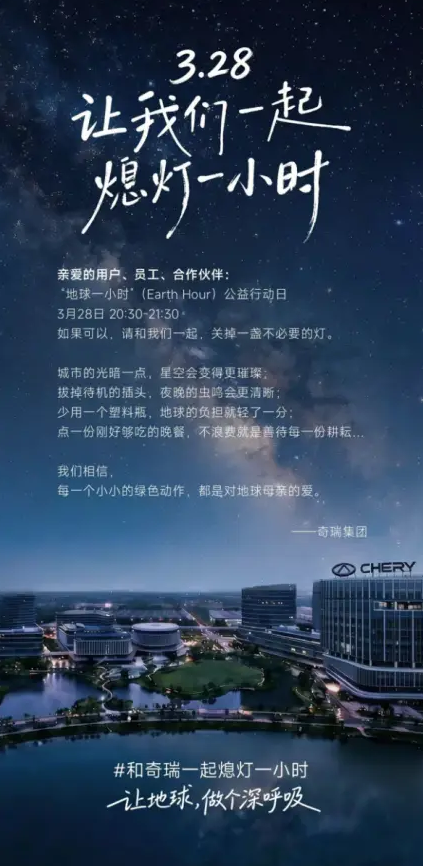 3月28日的“地球一小时”熄灯行动,是奇瑞绿色行动的一个缩影,而全球ESG顾问大联盟的成立,则是奇瑞绿色转型的重要里程碑。未来,奇瑞将继续依托联盟的智力支撑,深化绿色发展战略,扩大绿色“朋友圈”,用科学的理念、先进的技术、扎实的行动,推动企业实现更高质量的可持续发展,为全球ESG发展贡献中国智慧和中国方案。