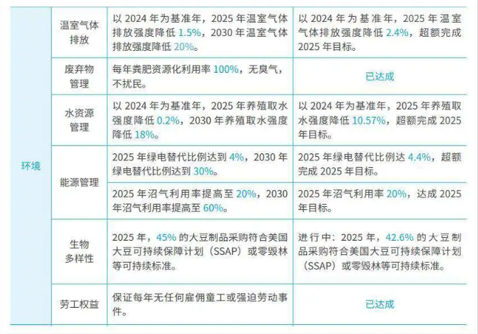 2025年,牧原按照治理、环境、社会三大方面,给出了18个可量化目标,事后验证看,完成度非常高。其中,在环境方面,围绕温室气体排放、废弃物管理、水资源管理、能源管理、生物多样性等设置了多个子目标,多项超额完成。
