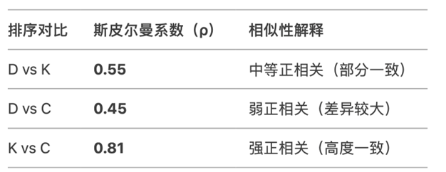 我目测三者给出的答案很相似,只是略有不同。于是,我又问了DeepSeek最后一个问题:用数学方法,比较三个排序的相似性。DeepSeek很快就给了答案。它用了一个名为“斯皮尔曼等级相关系数”的参数来衡量两个排序之间的单调性关系。结果如下,即Kimi和ChatGPT是高度一致,而DeepSeek则相对有些离散。我觉得这个问题其实是没有意义的,但它仍然给出了很认真且专业的思考和回答。