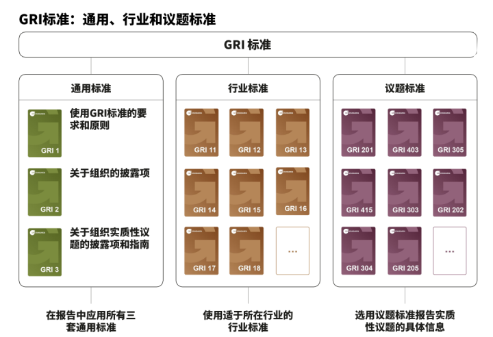 GRI框架体系由一系列相互关联的标准组成,这些标准分为三个层级:通用标准、行业特定标准和议题特定标准。通用标准为所有组织提供基本的报告要求和原则,行业特定标准帮助组织根据其特定行业背景识别和报告相关的实质性议题,而议题特定标准则提供了针对特定议题的详细披露要求。