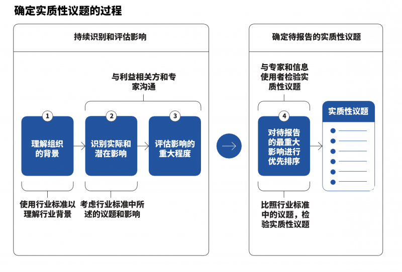 整个过程要求组织与利益相关方和专家进行沟通,使用行业标准来理解行业背景,并持续识别和评估影响,以确保报告内容的相关性和实质性。